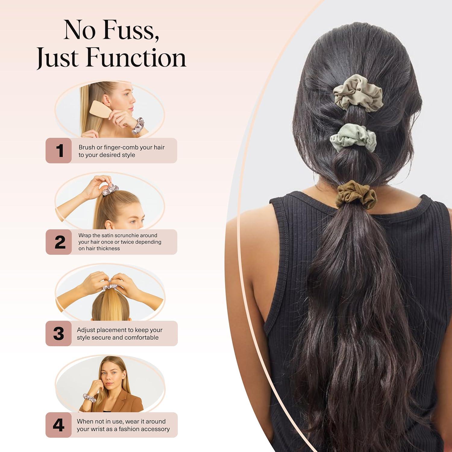 NO SNAG, NO TUG HOLD: Designed with a soft, flexible elastic, these satin hairties provide a secure hold without pulling or catching strands. Each scrunchie satin accessory glides effortlessly through hair, helping prevent damage caused by tight elastics. Perfect as hair ties scrunchies for ponytails, buns, or half-up styles, these satin hair scrunchies support healthy-looking hair with every wear.
