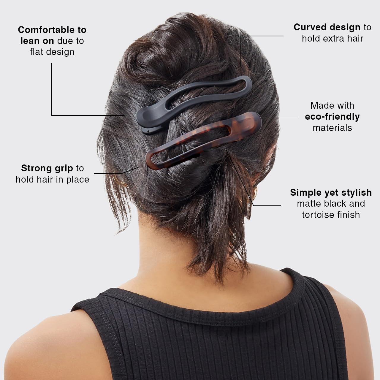 imageKitsch Flat Hair Clips for Women  Strong Hold No Slip Grip Flat Claw Clips For Secure and Comfortable Look  Durable Recycled Plastic Hair Accessories  Ideal Gifts for Women  Black ampamp Tortoise 2pcCurve